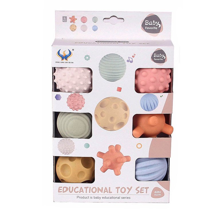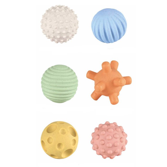 Set od 6 raznobojnih gumenih loptica za bebu, različite veličine i teksture.